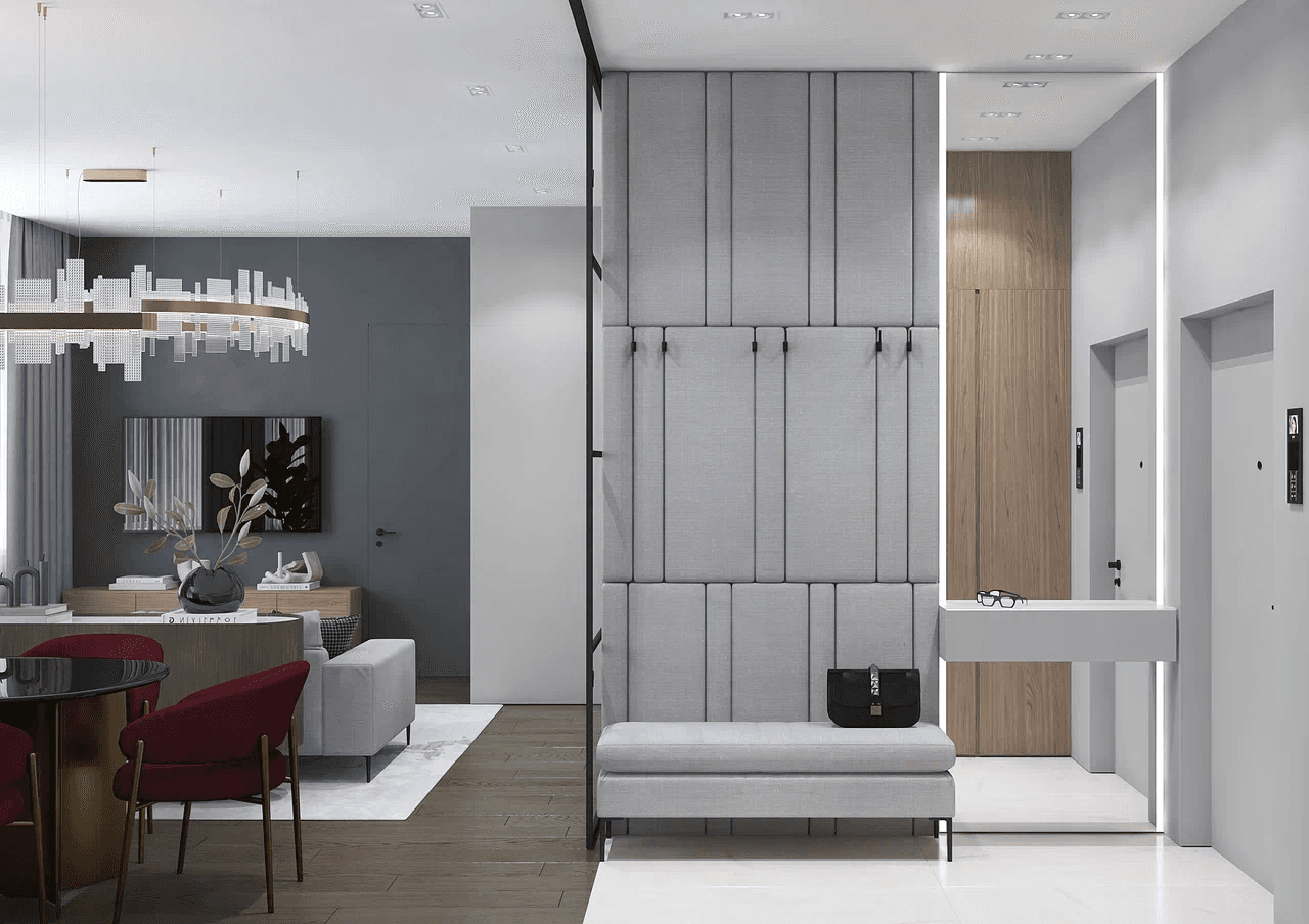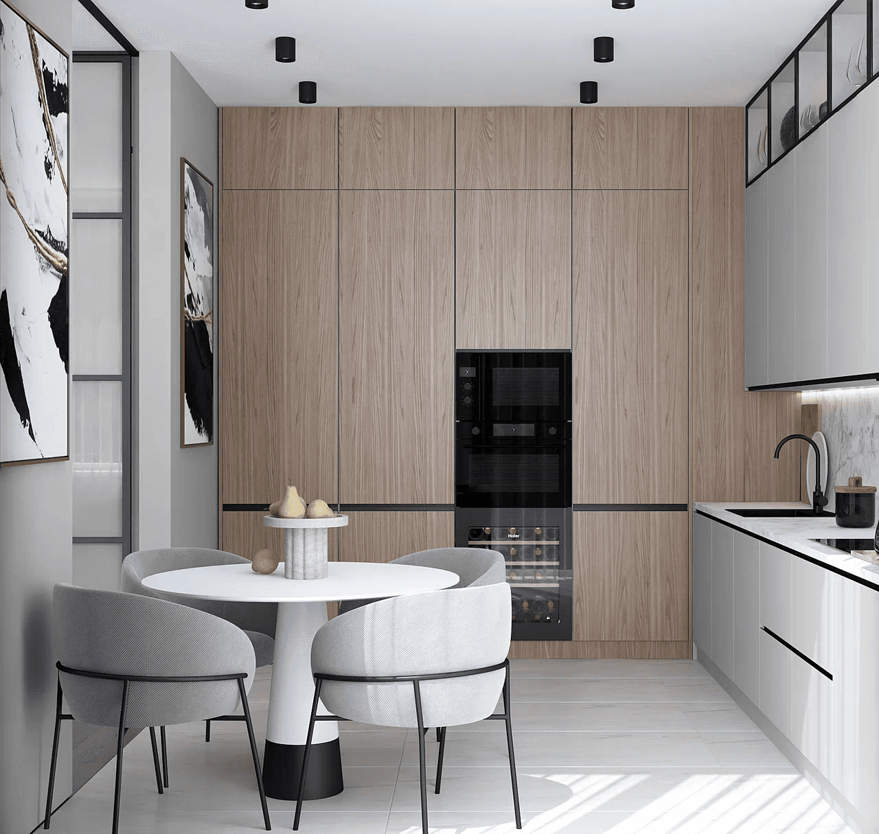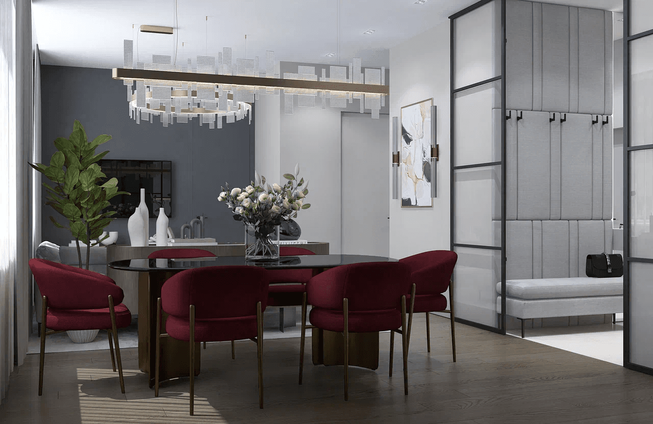Для гостиной с обеденной зоной была выбрала серая гамма с акцентами в виде бордовой обивки стульев и диванных подушек, а также матового золота в каркасах стульев и фурнитуре светильников. Графичность в интерьер привнесли за счет рисунка сдвижных стеклянных перегородок и черных мебельных ножек. В той же серо-черной гамме решен интерьер кухонной зоны. А для мебели выбрано сочетание фасадов в эмали и шпоне, элементы из дерева добавили ноты уюта и тепла в интерьер.