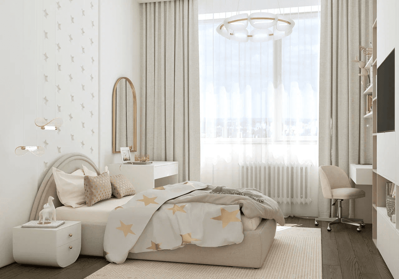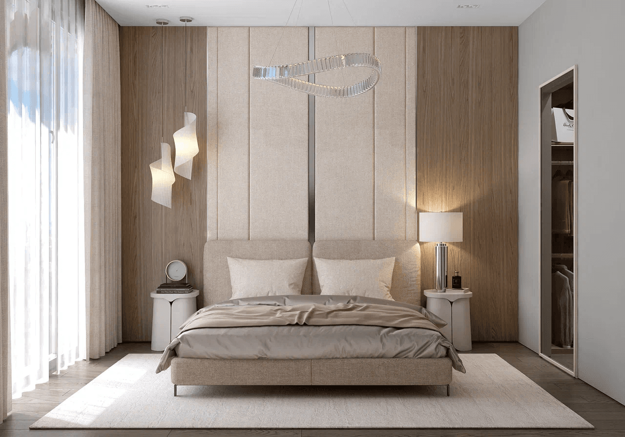 Для спальни выбраны мягкие природные тона и фактуры: оттенки бежевого и молочного, отделка стен шпонированными и мягкими панелями с выраженной фактурой ткани. Хромированные детали разбавили теплую гамму. Интересная деталь – асимметричные светильники по бокам кровати: крупные подвесные светильники с одной стороны и настольная лампа с другой.