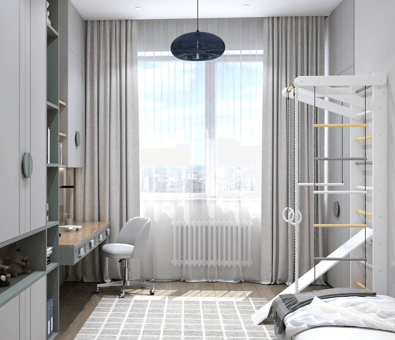 Заказчики квартиры в ЖК Прайм Тайм – семейная пара с двумя разнополыми детьми. В квартире много света за счет высокого этажа, а также высоты потолков 3,4 метра. Задачей было спланировать пространство таким образом, чтобы у всех членов семьи были и приватные зоны, и зоны для совместного времяпрепровождения.