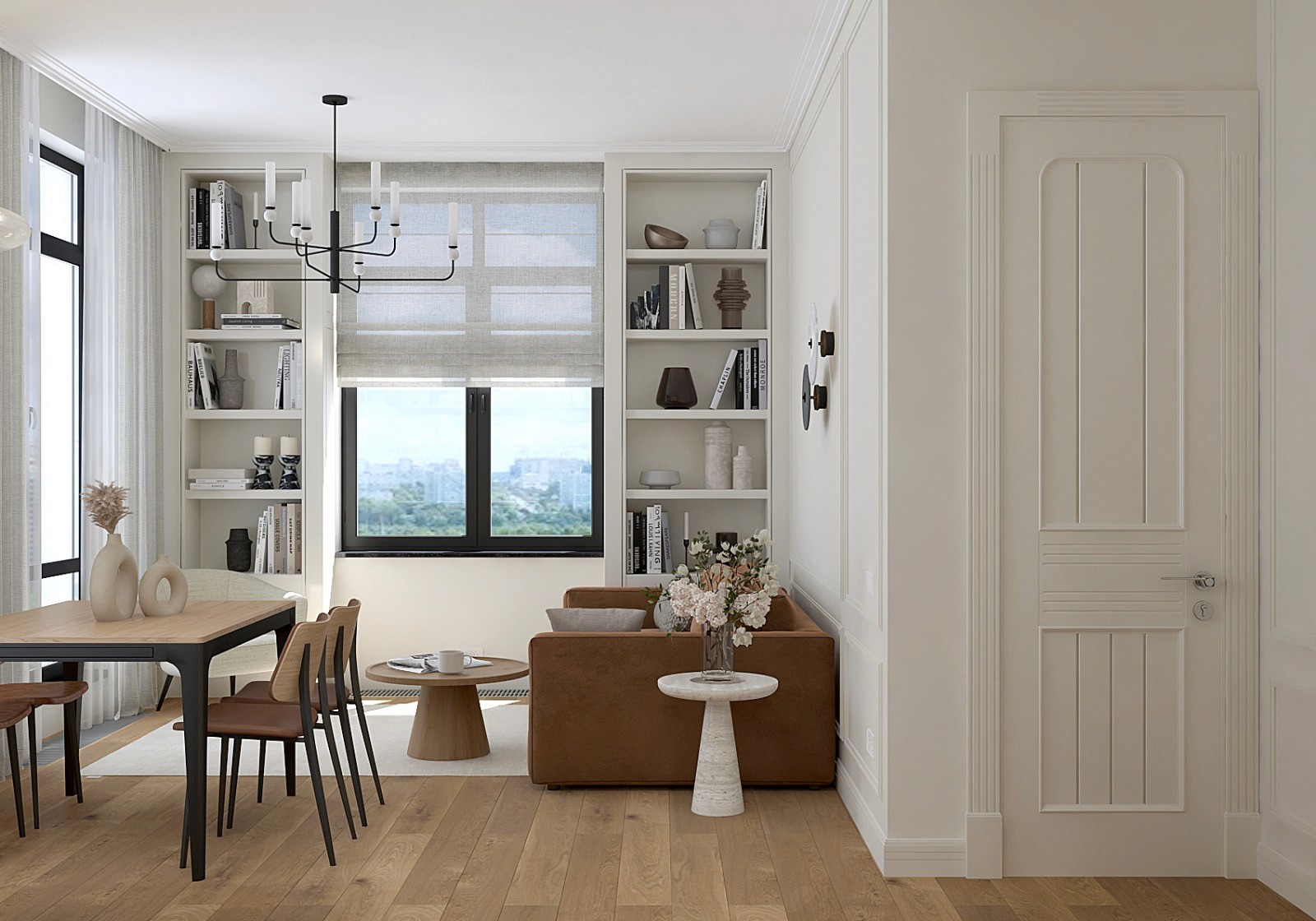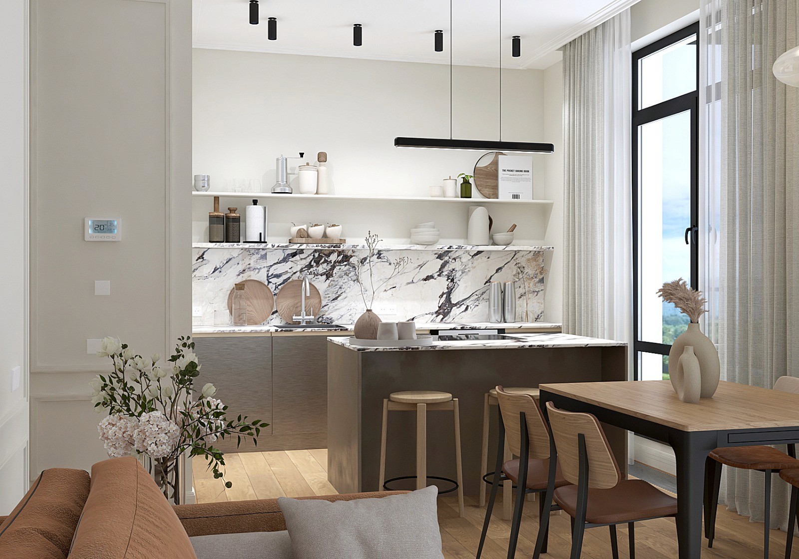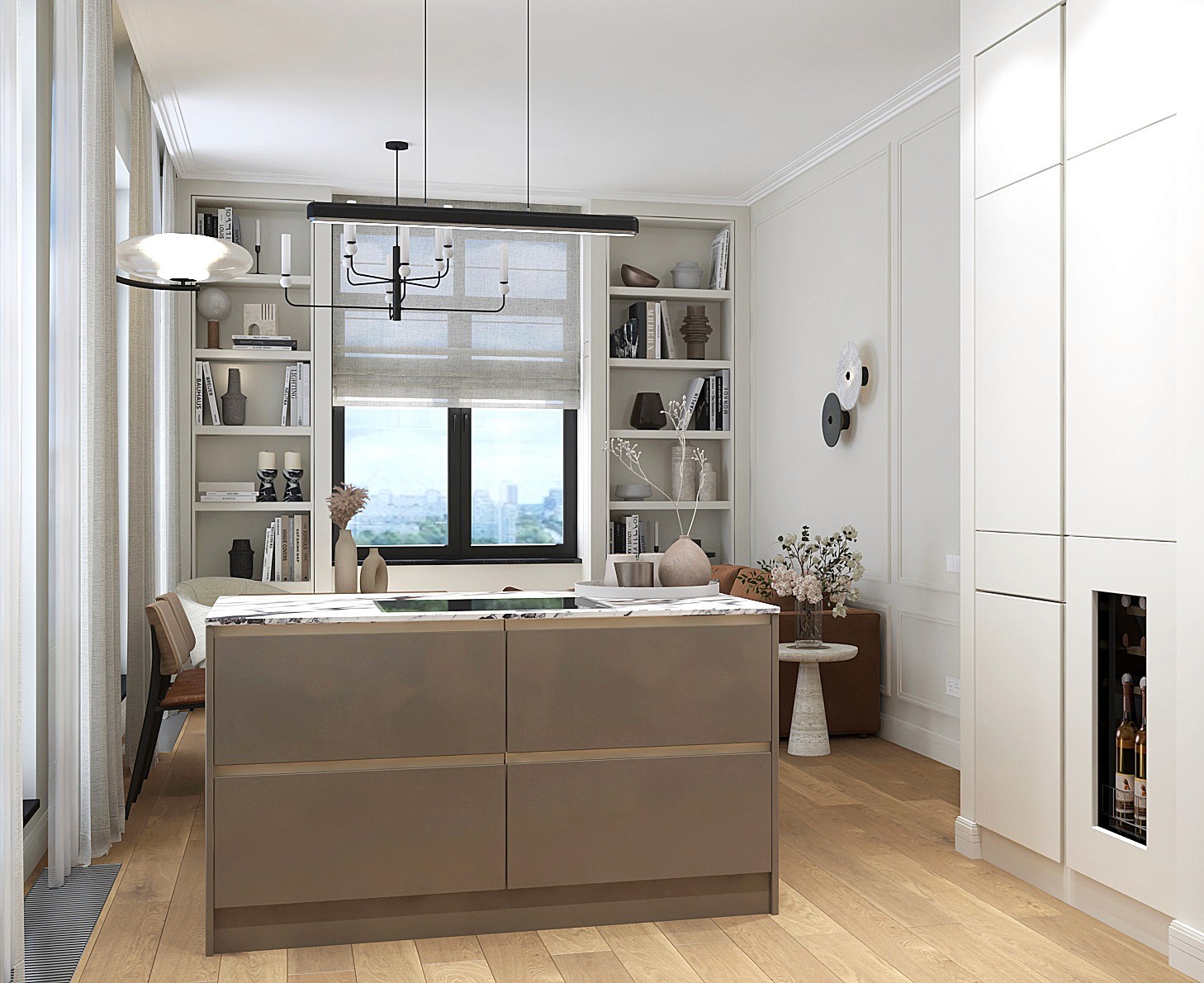 Квартира 75 кв.м для семьи с маленьким ребенком спроектирована в светлых нейтральных тонах, которые мы разбавили темными элементами, придающими интерьеру графичность: это контрастные оконные рамы, черные и темно-коричневые элементы мебели, фурнитура светильников. Органично вписаны предметы современного искусства: картины и панно, а мастер-гардеробную украшает арт-объект из хлопка, выполненный в мексиканской мастерской. Этнические элементы нашли также отражение в орнаменте полубарных стульев у кухонного острова.