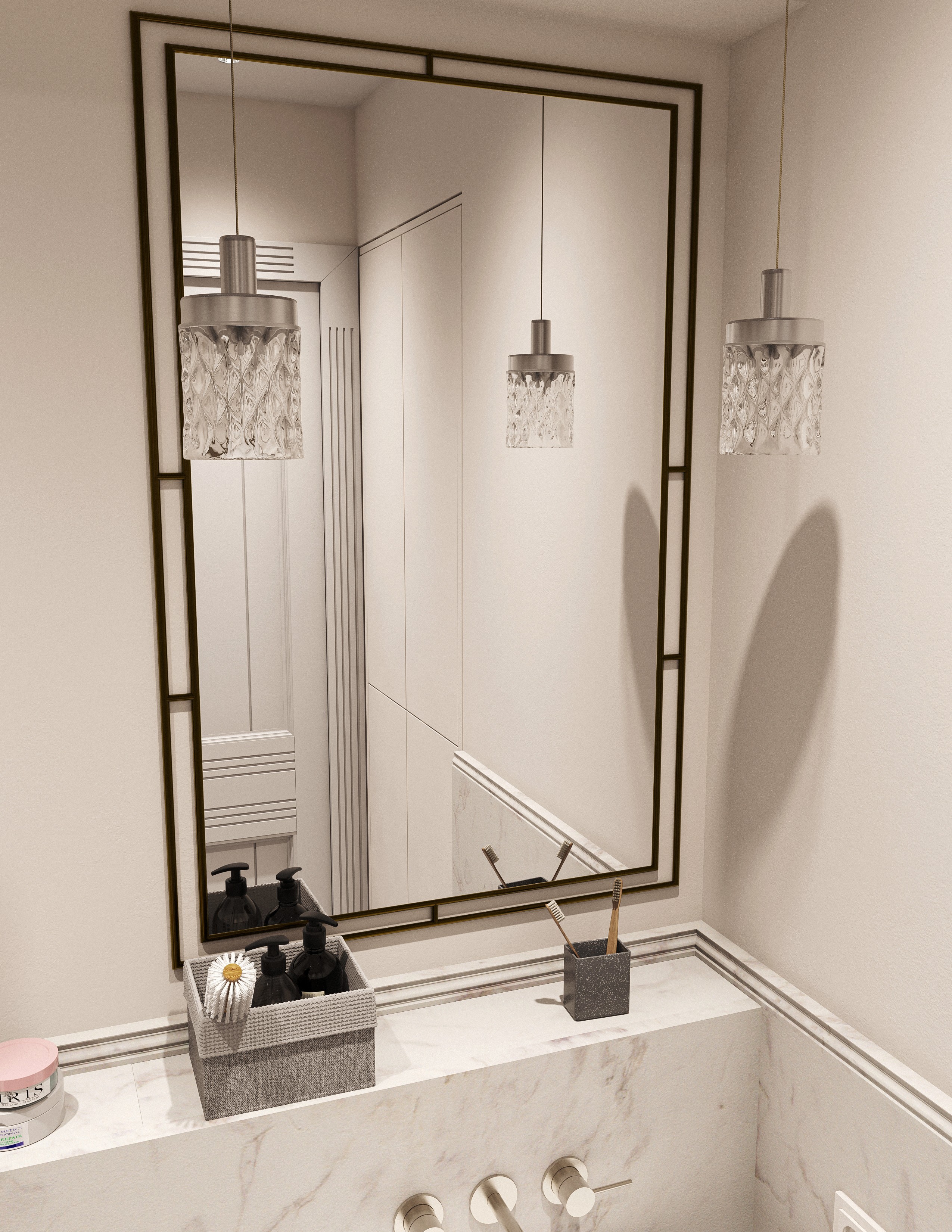 Особое значение заказчики придают освещению. Их пожеланием было создать уютные зоны с рассеянным светом и разными сценариями, чтобы создать обволакивающие эффекты света и мягкие тени, поэтому мы провели серьезную работу по подбору светильников: люстр, бра, торшеров, точечной подсветки, а также вариантов ламп к ним, чтобы добиться желаемого эффекта.