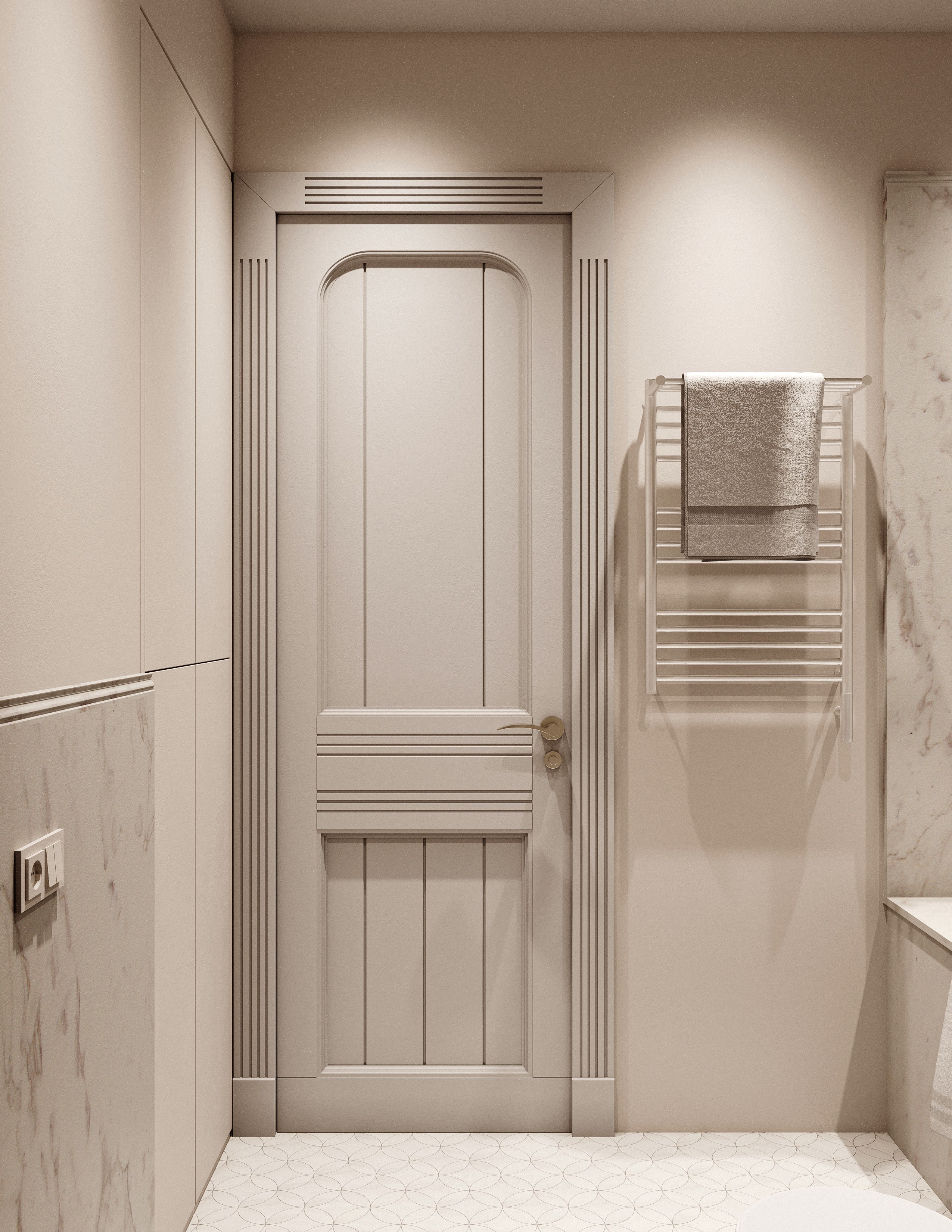 Интерьер стал продолжением архитектурного облика здания и выполнен в неоклассическом стиле с использованием отделочных материалов премиум-класса: натурального мрамора и травертина, шпона дуба и эвкалипта, высококачественной краски Little Greene, немецкой инженерной доски HAIN. Мебель, сантехника и светильники привезены на заказ из Европы. Встроенная мебель и двери изготовлены компанией премиальных столярных изделий Attribut по разработанным нами индивидуальным эскизам.
